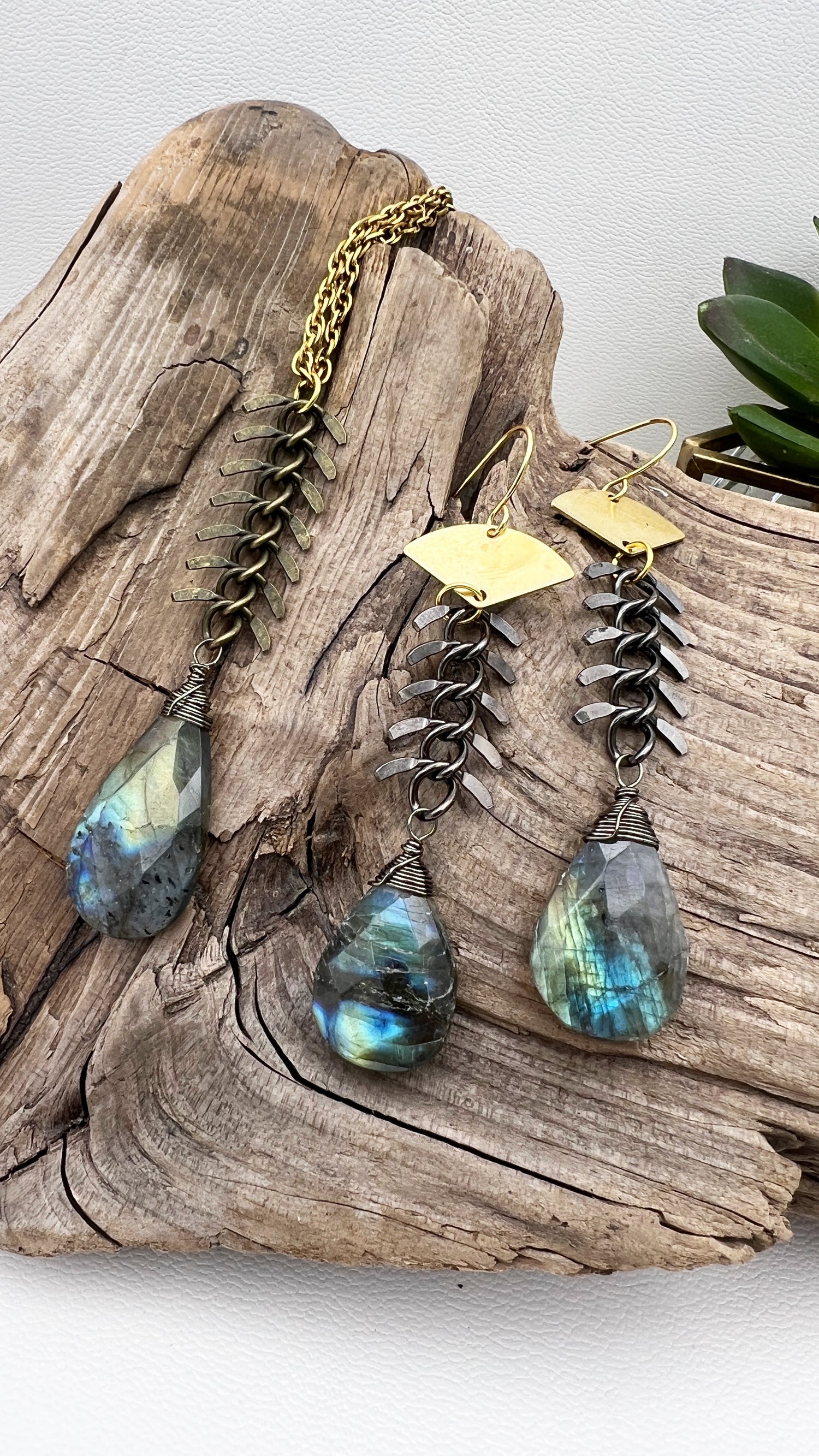This set is designed with a dragon spine component to add mystery and interest to the rough labradorite drops. Easily one of my favorites. Sadly only one set available currently.